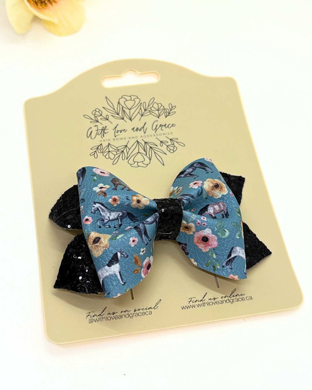 The Horse Pinch Bow from our Little Farmer collection is a perfect accessory for any horse lover. Made from vegan leather, it adds a touch of fun and style to any outfit. Giddy up and add this quirky bow to your collection!