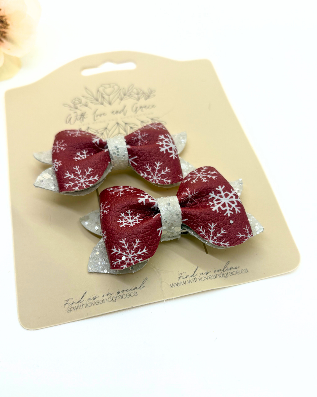 Dance under the magic of a starry sky with the Starry Night Pinch Piggy Bow! Covered in sparkling snowflakes gently falling, this playful accessory adds a twinkle of winter wonder to any outfit. Perfect for celebrating the season with a touch of snowy delight!